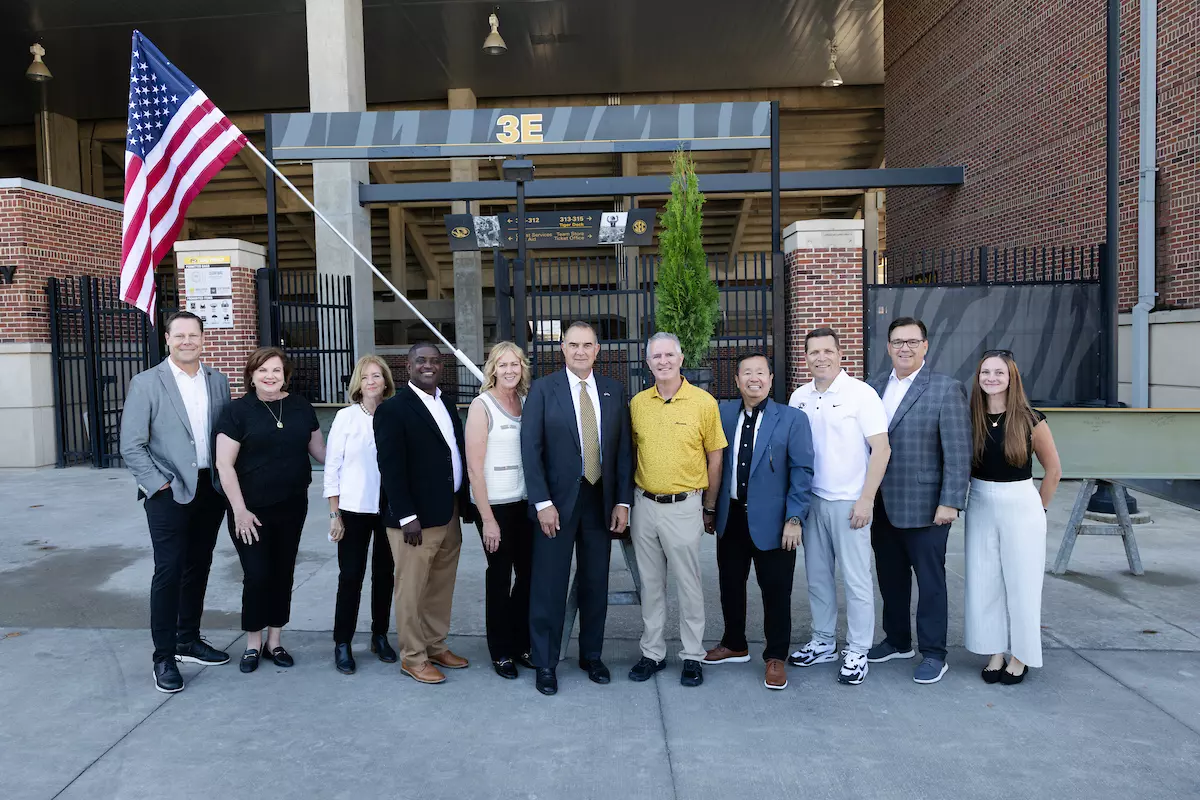 Featured speakers included University of Missouri President Mun Choi, Missouri Gov. Mike Kehoe, Mizzou Director of Athletics Laird Veatch and University of Missouri Board of Curators Chair Todd Graves. Following their remarks, the leaders joined donors, Mizzou Athletics staff and representatives from construction manager Whiting-Turner, architectural firm DLR Group and Mizzou Planning, Design and Construction (PD&C) in ceremonially signing the final steel beam before it was raised into place.