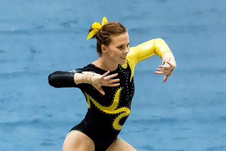 ? Competed on the uneven bars and floor in her first collegiate meet against Iowa State